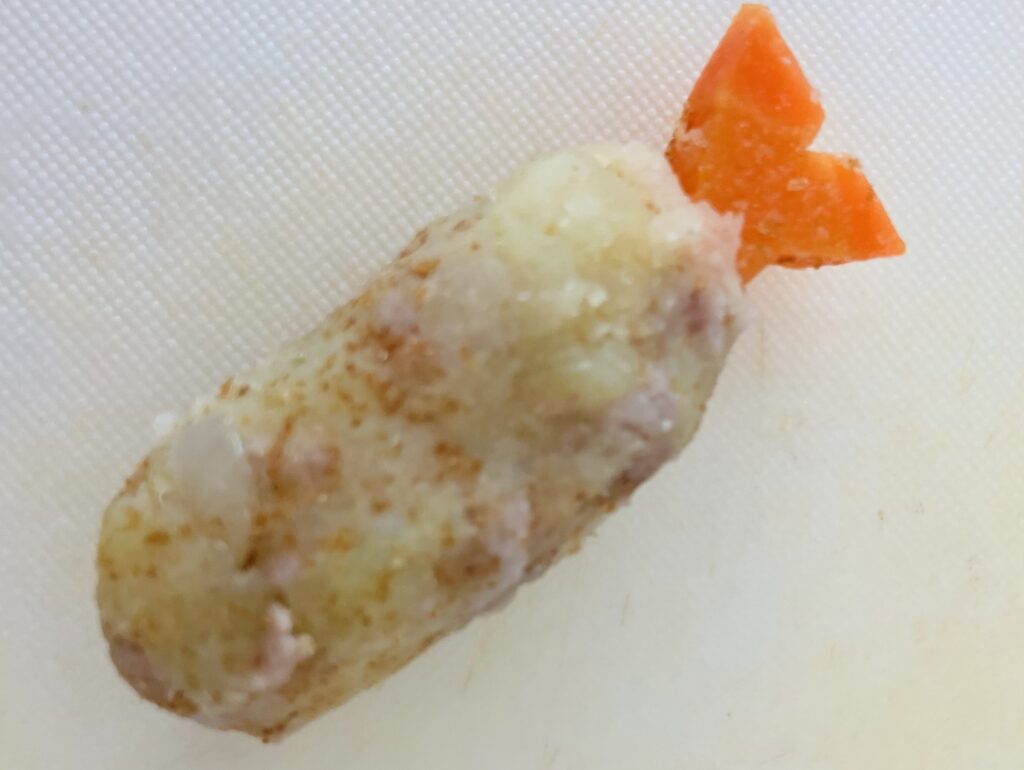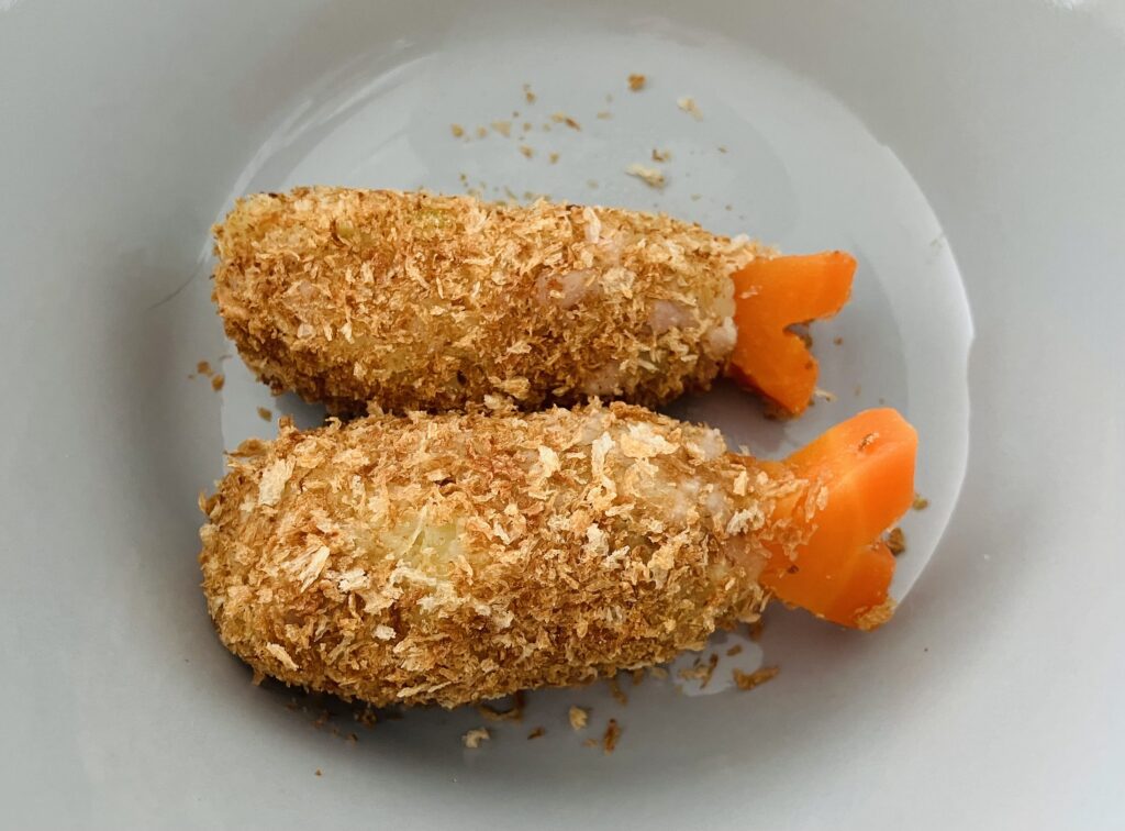 - 手順9人参に8をつけてエビフライ風に成形し、パン粉をまぶす【コロッケ完成】
