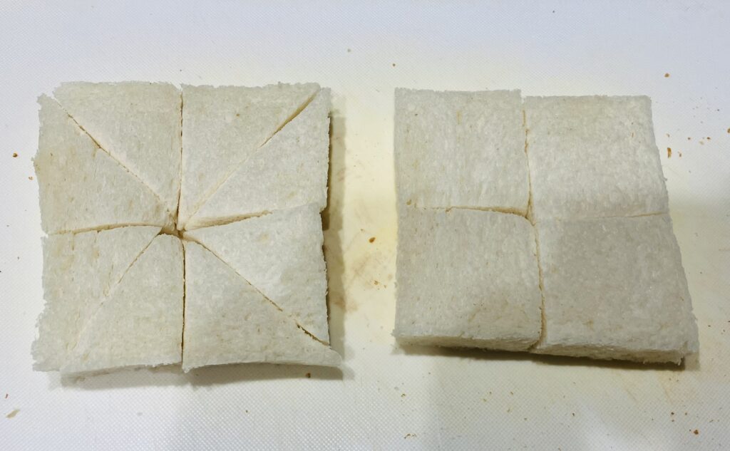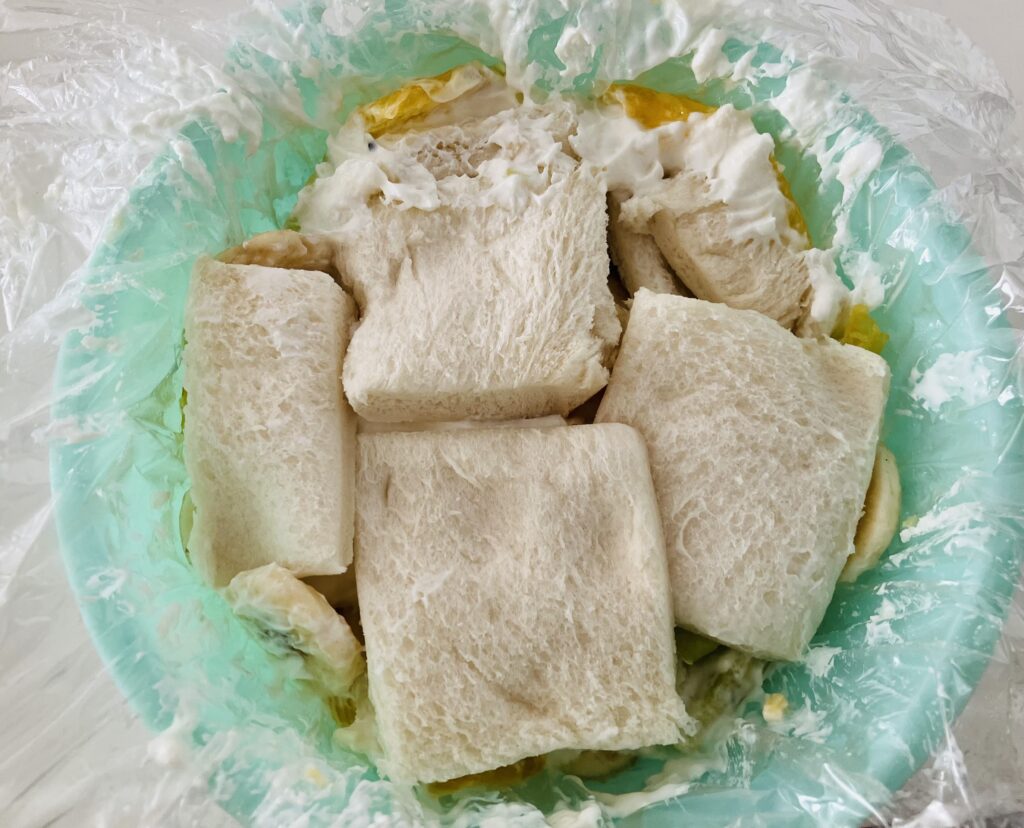 ⑤ 食パン(三角)をボウルの形にそってのせる