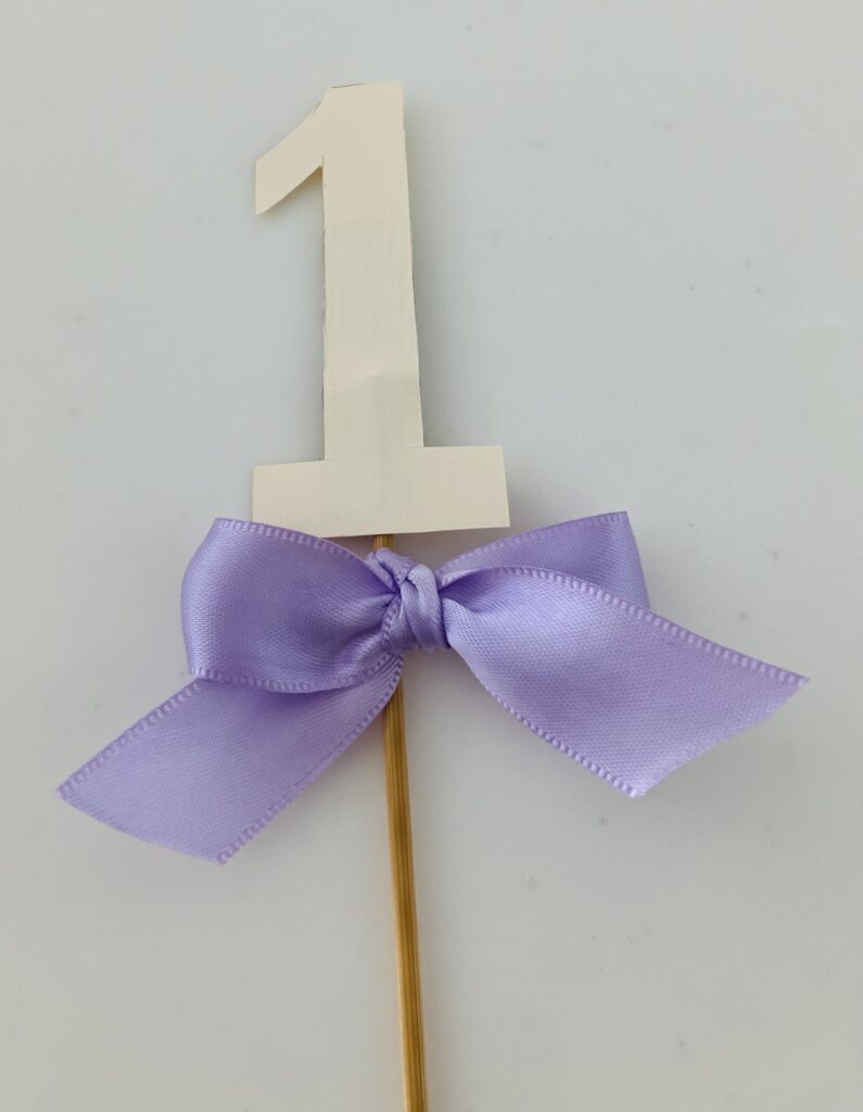 竹串に”1”と切り取った色画用紙をくっつけて、リボンを結んだだけの超簡単ケーキトッパー。