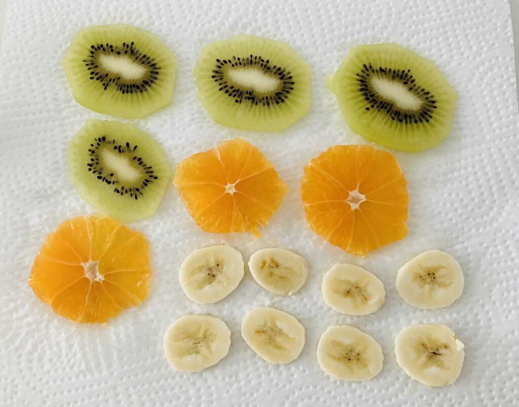 ① フルーツを断面が見えるようにカットし、水気をキッチンペーパーで取る。