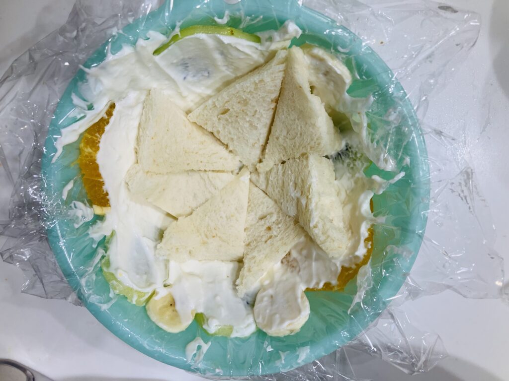 ⑥ヨーグルト→フルーツ→ヨーグルト→食パン(四角)の順に重ねる
