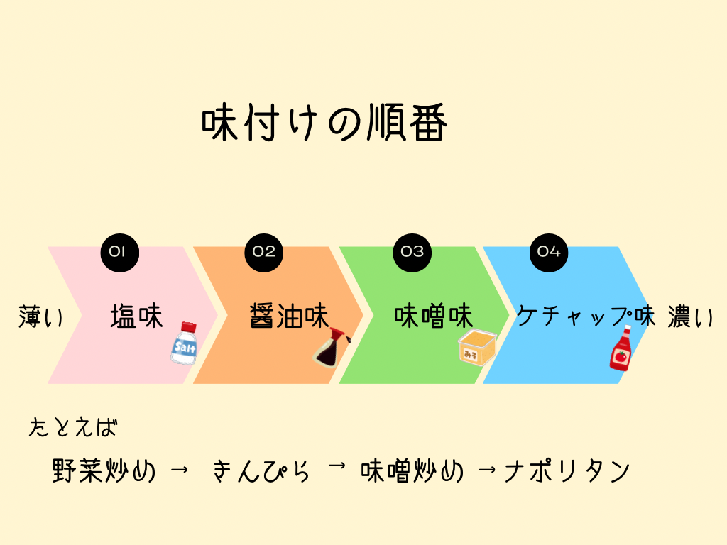 ひとつのフライパンを使い続けるコツとして、焦げ付きにくいフライパンを使うのも大事ですが、味付けの順番もポイントです。