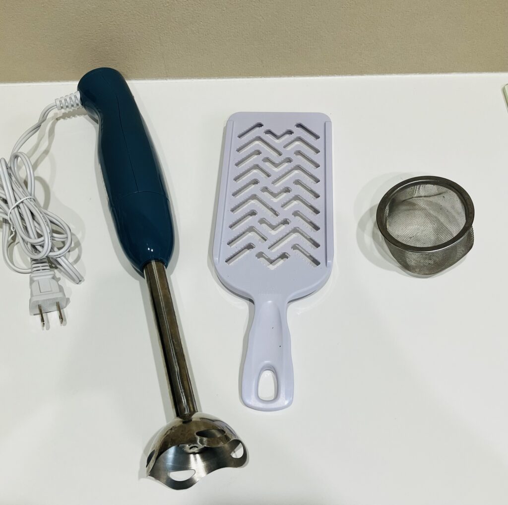離乳食初期のペースト状はハンドブレンダーと茶こし、すりおろし器で対応可能でした。